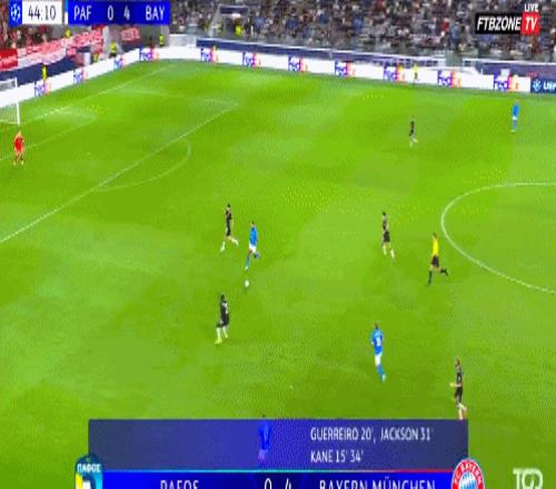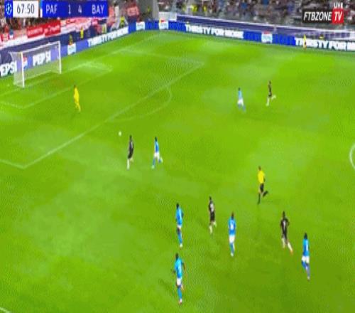 拜仁實(shí)力優(yōu)勢(shì)明顯,從開(kāi)局就壓著對(duì)手猛攻。第7分鐘,迪亞斯左路突破,內(nèi)切之后起腳勁射,帕福斯門將飛身將球撲出。緊接著的角球攻勢(shì),奧利塞送出傳中,凱恩高難度倒鉤攻門,可惜擊中橫梁彈出。