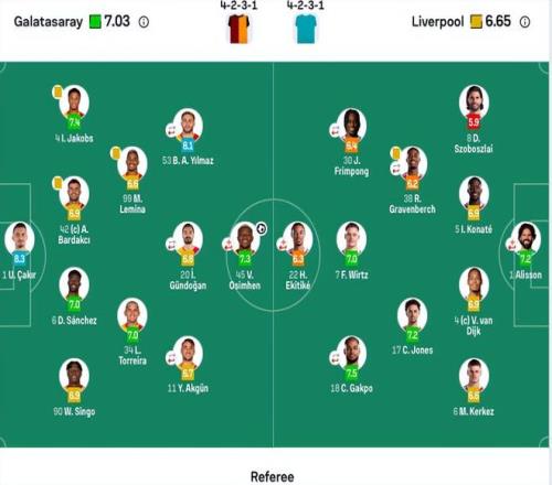 加拉塔薩雷首發(fā):1-恰基爾、90-辛格、6-達文森·桑切斯、42-巴爾達什徹、4-伊斯梅爾-雅各布斯、34-托雷拉、99-勒米納、11-阿克金(71’7-羅蘭-紹洛伊)、20-京多安(75’8-薩拉)、53-伊爾馬茲(85’17-埃爾馬利)、45-奧斯梅恩(71’9-伊卡爾迪)。