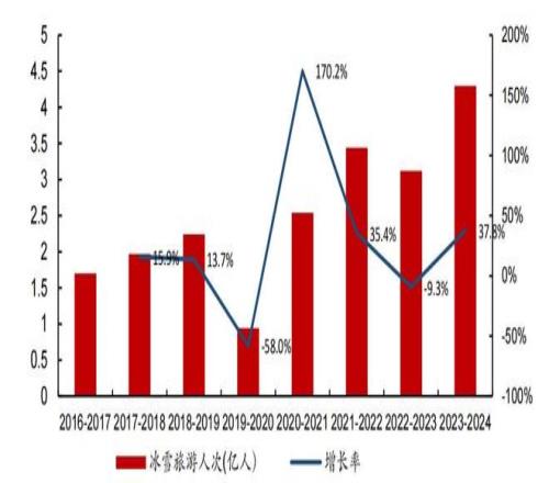 從行業(yè)視角來看,自2015年北京成功申辦2022年冬奧會以來,中國冰雪產(chǎn)業(yè)進入了快速發(fā)展階段。中國旅游研究院統(tǒng)計數(shù)據(jù)顯示,2023-2024雪季是“后冬奧時期”首個完整的冰雪旅游季,該雪季國內(nèi)冰雪休閑旅游人數(shù)達到了 4.3 億人次,創(chuàng)下新高。