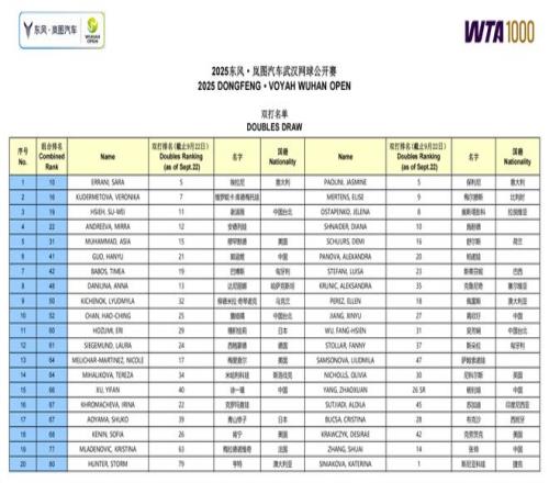 巴黎奧運會女雙金牌得主、今年法網(wǎng)女雙冠軍埃拉尼/保利尼領(lǐng)銜出戰(zhàn)武網(wǎng)女雙,中國金花張帥將攜手前女雙“球后”梅拉德諾維奇亮相,謝淑薇/奧斯塔彭科、安德列娃/施耐德等組合也頗具看點。