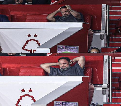 球隊老板希臘船王馬里納基斯在看臺上親眼目睹了球隊再度收獲一場失利后,在看臺上神情顯得格外猙獰,再度露出死亡凝視。