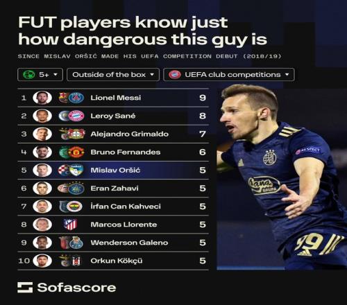 比如Sofascore,他們就給出一個過去8個賽季歐冠禁區(qū)外遠射進球榜。為什么是過去八年呢?因為這是給剛激活個人里程碑的米斯拉夫·奧爾西奇定制的數(shù)據(jù)。這也很好說明了梅西的實力,無論給誰定制數(shù)據(jù),他都可以是第一、第一檔或者獨一檔。