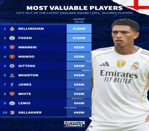 落選新一期英格蘭大名單球員身價(jià)榜:貝林厄姆居首、福登第二