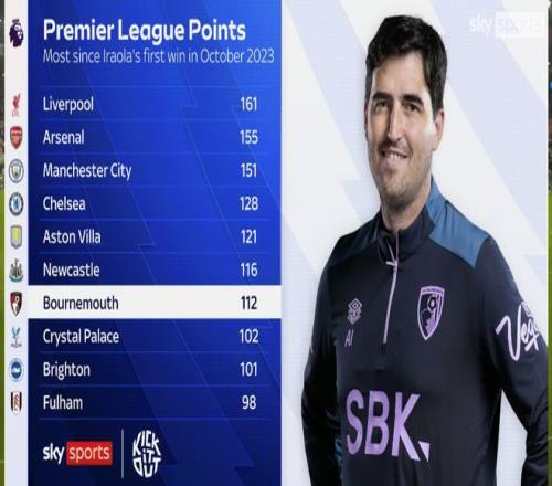 有能名帥!自23年10月以來,伯恩茅斯累計積分位列英超第7