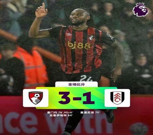 第78分鐘,伯恩茅斯扳平比分!塞門約在左側強行帶球過人,突入禁區(qū),小角度低射,皮球從門將襠下穿過去,鉆入球門!這粒進球完全是依靠個人能力!6分鐘后,伯恩茅斯再進一球!克魯伊維特轟出一腳無解世界波!伯恩茅斯反超比分!第96分鐘,伯恩茅斯又進球了!依然是塞門約,他在禁區(qū)內(nèi)包抄推射打進,殺死比賽!最終的比分定格為3-1,伯恩茅斯逆轉擊敗富勒姆!