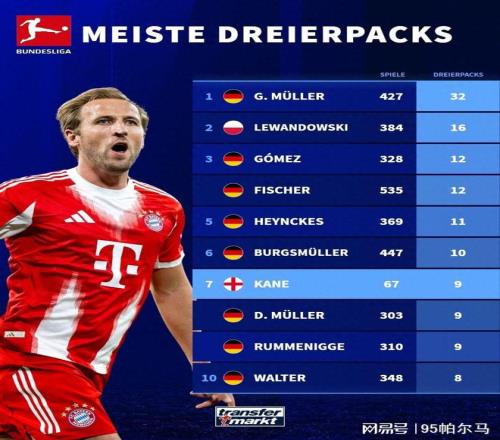 對標(biāo)姆巴佩,參照梅西,32歲的凱恩并沒有辜負(fù)“大英帝星”的頭銜,以至于兩屆德甲金靴的履歷并不能完全匹配星光,或者說他在德甲真正意義上實現(xiàn)了降維打擊。比如他只用了67場比賽就完成了9次帽子戲法,他只用了104場就完成拜仁百球里程碑,并成為21世紀(jì)最快為五大聯(lián)賽俱樂部打進(jìn)百球的球員。