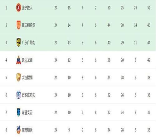 此外,中甲聯(lián)賽不停擺,北京時間10月4日19:30,中甲聯(lián)賽第25輪三場比賽同時開球,南通支云VS青島紅獅、佛山南獅VS大連鯤城、定南贛聯(lián)VS延邊龍鼎。中甲24輪戰(zhàn)罷,遼寧鐵人以52分領(lǐng)跑,重慶銅梁龍積46分排名第二,廣東廣州豹積44分,排名第三,延邊龍鼎積42分,排名第四。