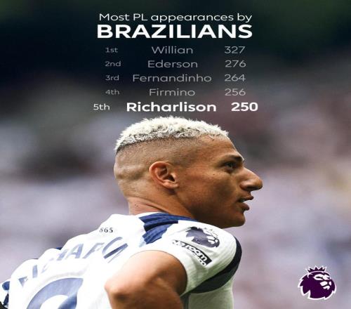本場比賽,熱刺前鋒里沙利松在英超中達(dá)到了一個(gè)重要的里程碑——他成為了第五位在英超聯(lián)賽中出場達(dá)到250次的巴西球員。