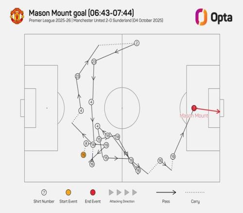 據(jù)統(tǒng)計,芒特的這粒進球經(jīng)歷了連續(xù)18次傳球,這是本賽季英超聯(lián)賽中進球傳遞次數(shù)并列最多的,也是自2023年9月布魯諾-費爾南德斯對陣伯恩利(同樣為18次)以來,曼聯(lián)在聯(lián)賽中進球前傳球次數(shù)最多的。