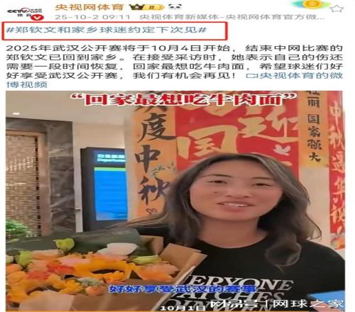 此外,在鄭欽文剛回到武漢沒多久,央視體育官網(wǎng)在報(bào)道這則消息時(shí),已經(jīng)提前說了鄭欽文會(huì)退出武網(wǎng)一事,標(biāo)題“鄭欽文和家鄉(xiāng)球迷約定下次見”就是最好的證明。