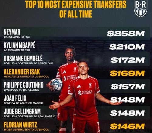今年夏天,利物浦在轉(zhuǎn)會市場上搖身一變?yōu)椤敖鹑诰搠{”。紅軍瘋狂撒錢,砸1.45億歐簽下伊薩克,砸1.25億歐簽下維爾茨,這兩人的轉(zhuǎn)會費(fèi)均打破了英超此前的引援轉(zhuǎn)會費(fèi)紀(jì)錄。外界驚呼英超要提前大結(jié)局了。