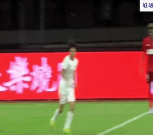 第43分鐘,茹子楠左路內(nèi)切之后右腳勁射,韓镕澤撲救不及,皮球直入死角,梅州客家取得領(lǐng)先。