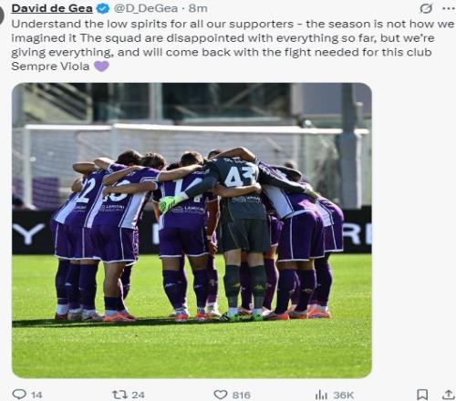 雷速體育10月6日報道宣稱 意甲第6輪,佛羅倫薩主場以1-2遭羅馬逆轉(zhuǎn)。在前6輪的比賽里,佛羅倫薩僅取得3平3負(fù)的戰(zhàn)績,迄今仍然沒有取得過勝績。比賽結(jié)束后,佛羅倫薩門將德赫亞在社媒發(fā)文,談到球隊的低迷態(tài)勢。
