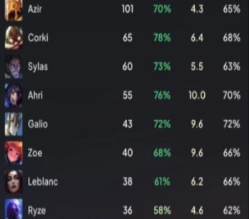 狐貍55場(chǎng)76%勝率;加里奧43場(chǎng)72%勝率;佐伊40場(chǎng)68%勝率;