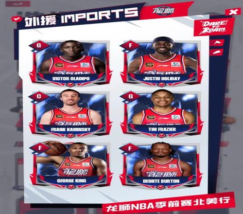 在本次NBA季前賽開始前,廣州龍獅俱樂部一口氣簽下奧拉迪波、賈斯汀·霍勒迪、卡明斯基、蒂姆·弗雷澤、喬治·金和德恩特·伯頓等六位臨時外援,在為期半個月的北美行期間,他們參與到廣州龍獅的日常行程和訓(xùn)練當(dāng)中,并隨隊征戰(zhàn)即將到來的三場NBA季前賽。他們在爭取留在NBA,同時廣州隊或者其他CBA球隊也可以通過NBA季前賽考察這些球員。