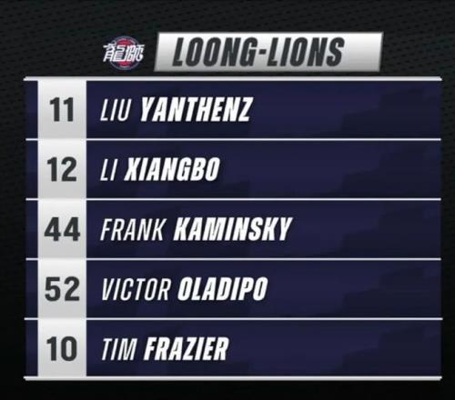 本場比賽,廣州龍獅首發(fā)陣容是:卡明斯基、奧拉迪波、弗雷澤、李祥波和劉顏城。