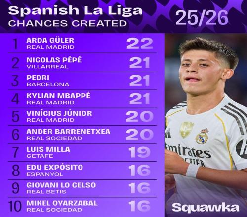 本賽季西甲創(chuàng)造機(jī)會排行榜: