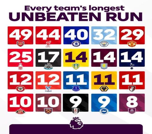 在本賽季英超已無開局不敗球隊后,英超官方列出了本賽季英超20支球隊各自的最長英超不敗紀(jì)錄。