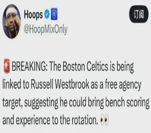 近日美媒Hoops爆料凱爾特人有意在自由市場簽下威少,希望為球隊(duì)的替補(bǔ)陣容補(bǔ)充得分火力和經(jīng)驗(yàn)。