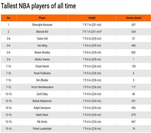至此,文班亞馬成為NBA歷史上第10位身高達到2米26及以上的球員(并列歷史第7)。NBA歷史上最高的球員是喬治·穆雷桑和曼努特·波爾,兩人的身高都是2米31。法爾、姚明、布拉德利和弗拉內(nèi)斯都是2米29,緊隨其后。內(nèi)維特、波德科爾金、布拉和文班亞馬同為2米26,并列排名歷史第7高。