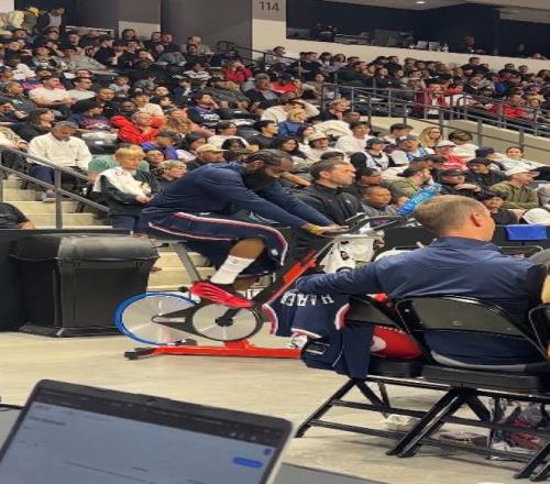 非常認(rèn)真!比賽期間哈登在場邊進行完整的單車訓(xùn)練