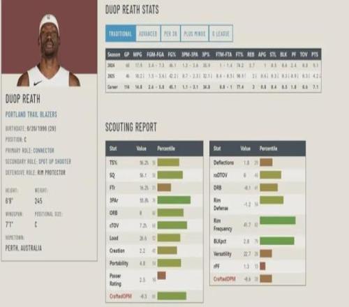 DRB防守籃板質(zhì)量,得分-0.1超越聯(lián)盟41%球員,防守籃板保護不佳也是影響杜普里斯出場的關(guān)鍵問題,在NBA防守籃板是中鋒看家立命的技能,這項技能不達標那就是軟,特別是強調(diào)防守的球隊,防守籃板不行那完全得不到主教練信任。
