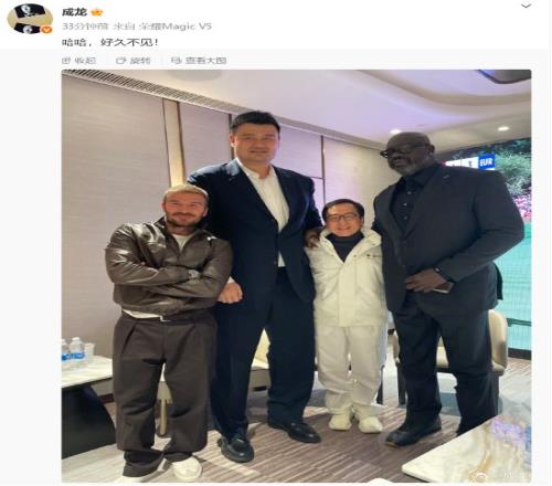 在首場(chǎng)比賽結(jié)束后,貝克漢姆在社交平臺(tái)上曬出與姚明、成龍和奧尼爾的合影,并寫道:“見到了三位傳奇,很棒的比賽?!背升垊t發(fā)文稱“好久不見”。