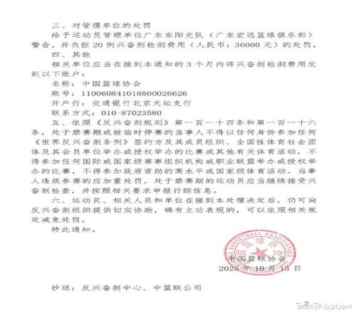 北京時間10月13日,中國籃球協(xié)會對興奮劑違規(guī)的中國男子籃球職業(yè)聯(lián)賽(CBA)外援吉倫沃特處以禁賽3個月的處罰,廣東宏遠籃球俱樂部作為管理單位受到了警告及負擔20例興奮劑檢測費用(人民幣36000元)的處罰,該單位的醫(yī)療與反興奮劑負責人、隊醫(yī)林志達被給予警告處罰。