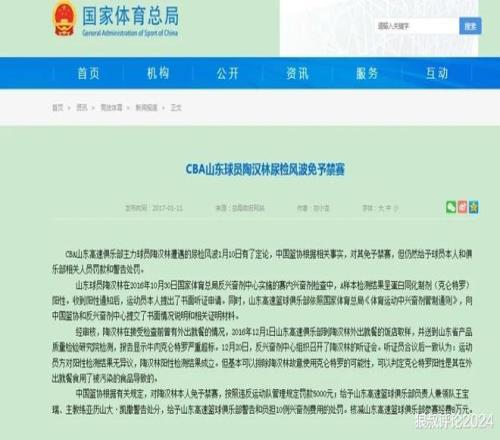 CBA山東高速俱樂部主力球員遭遇的尿檢風波1月10日有了定論,中國籃協(xié)根據(jù)相關事實,對其免予禁賽,但仍然給予球員本人和俱樂部相關人員罰款和警告處罰。