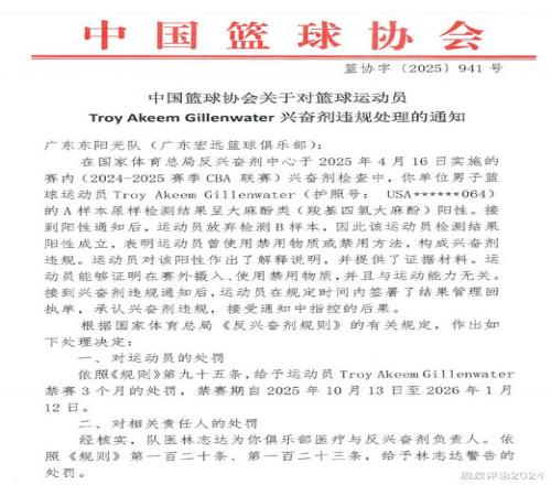 在國家體育總局反興奮劑中心于2025年4月16日實施的賽內興奮劑檢查中,你單位男子籃球運動員吉倫沃特的A樣本尿樣檢測結果呈大麻酚類(羧基四氫大麻酚)陽性。