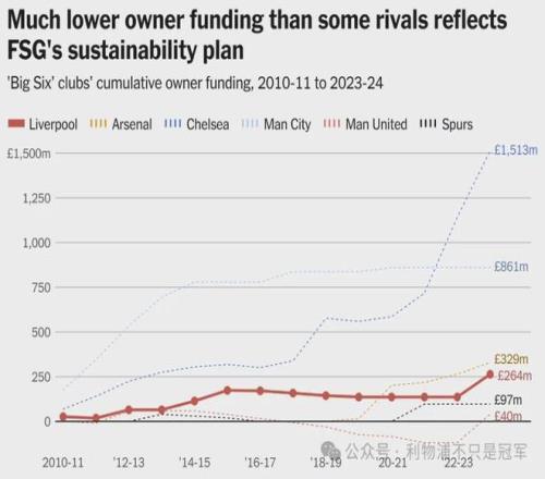 圖表:遠(yuǎn)低于部分競(jìng)爭(zhēng)對(duì)手的所有者注資反映了 FSG 的可持續(xù)計(jì)劃。自 FSG 在 2010-11 賽季初收購(gòu)利物浦以來,'Big Six' 俱樂部所有者注資的折線圖,其中利物浦的 2.64 億英鎊低于其他三家,并顯著低于切爾西和曼城。