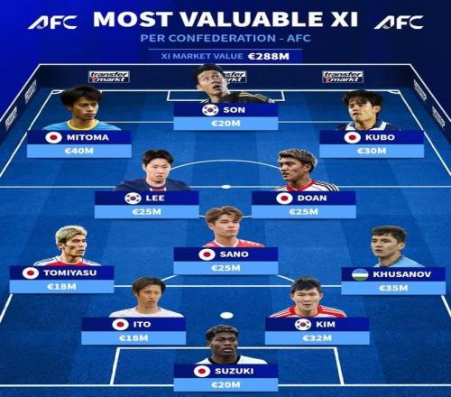 德轉(zhuǎn)列亞洲球員最貴11人陣容: