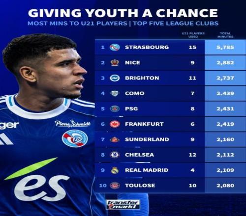 北京時(shí)間10月16日,德轉(zhuǎn)統(tǒng)計(jì)出了本賽季至今歐洲五大聯(lián)賽俱樂部U21球員的出場(chǎng)時(shí)間排行榜,斯特拉斯堡15名球員共計(jì)出場(chǎng)5785分鐘高居第一,巴黎圣日耳曼、切爾西以及皇家馬德里也都進(jìn)入前10位。
