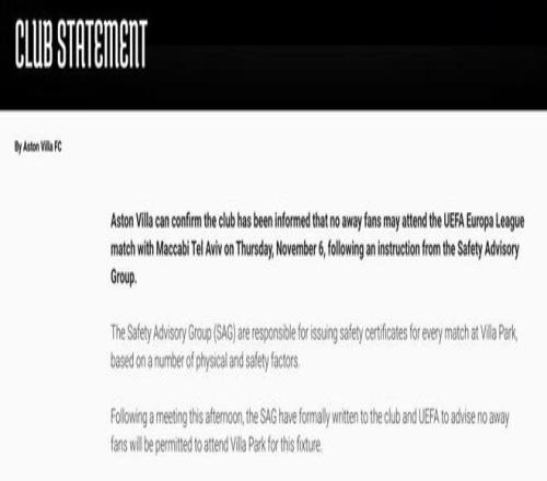 10月16日,阿斯頓維拉俱樂部官方宣布,11月6日歐聯(lián)杯聯(lián)賽階段第四輪主場對陣以色列特拉維夫馬卡比一戰(zhàn),將不允許客隊球迷入場。阿斯頓維拉在聲明中表示,這一禁令由負責主場維拉公園球場賽事安全許可的“安全咨詢小組(SAG)”決定。