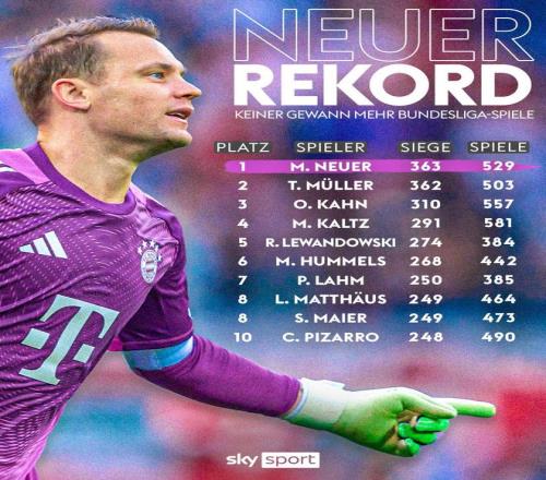 自諾伊爾2005年正式開啟一線隊職業(yè)生涯至今,共代表沙爾克04和拜仁慕尼黑出戰(zhàn)了529場德甲聯(lián)賽,取得了其中363場勝利。超越了老隊友托馬斯·穆勒(503場362勝)的紀錄,加冕成為德甲歷史勝場最多的球員。