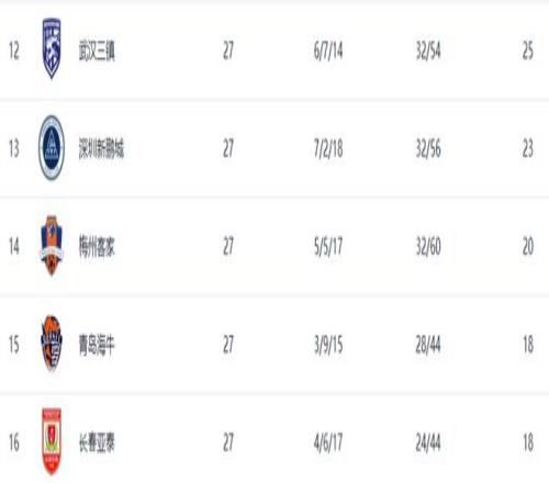 27輪之后,新鵬城以23分排名第13位,梅州客家以20分排名第14位,青島海牛、長春亞泰同積18分。