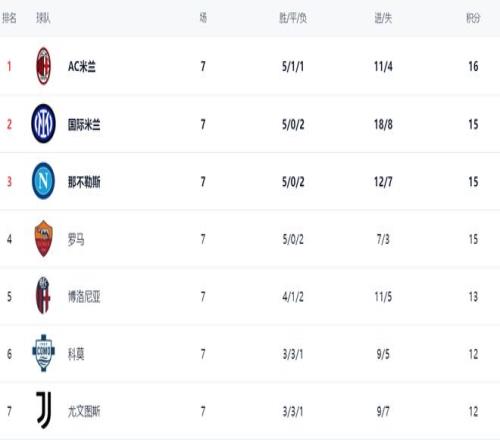 在意甲積分榜,AC米蘭的戰(zhàn)績(jī)是5勝1平1負(fù),拿到16分,排名榜首。而國(guó)際米蘭的戰(zhàn)績(jī)是5勝2負(fù),15個(gè)積分,排名第2。那不勒斯和羅馬也都是15個(gè)積分,凈勝球不如國(guó)際米蘭,排名第3和第4名。博洛尼亞以13分排名第5??颇陀任膱D斯都是12個(gè)積分,排名第6和第7。亞特蘭大只拿到11分,排名第8。至于拉齊奧,2勝2平3負(fù),只拿到8分,排名第11。