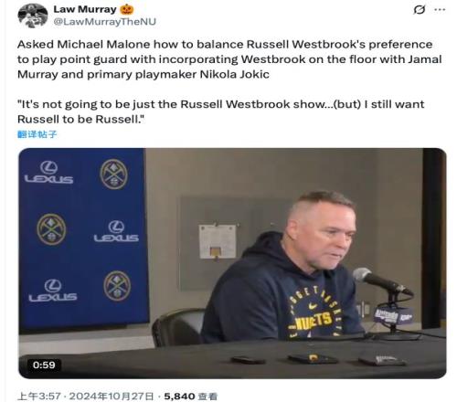 2024年休賽期,威少加盟掘金,賽季初的一次新聞發(fā)布會(huì)上,球隊(duì)主帥馬龍談到威少與約基奇、穆雷如何共存時(shí)表示:“這不會(huì)變成威少的個(gè)人秀……我依然希望威少做自己?!?/p>
