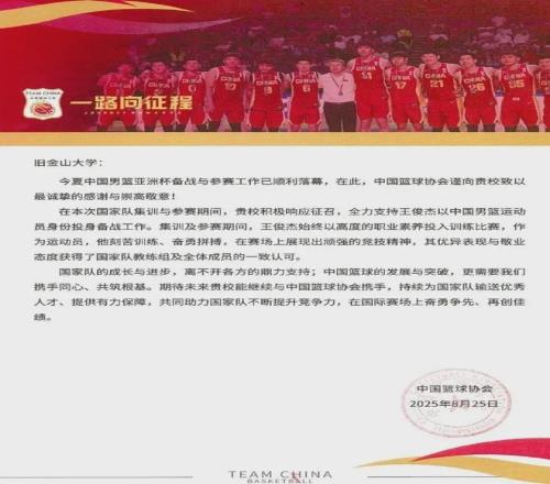 值得一提的是,今年8月末中國(guó)籃協(xié)向舊金山大學(xué)致信,主要是感謝他們支持王俊杰出戰(zhàn)亞洲杯,并期待未來(lái)能夠繼續(xù)攜手共進(jìn)。
