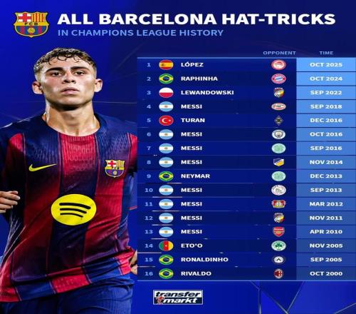 根據(jù)統(tǒng)計,費爾明是歐冠改制(1992-93賽季)以來,巴薩隊史第16位在歐冠當(dāng)中完成帽子戲法的球員。