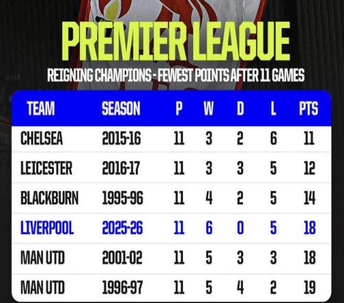 本賽季英超前11輪戰(zhàn)罷,作為衛(wèi)冕冠軍的利物浦只拿到18分,英超歷史上此前只有三支衛(wèi)冕冠軍同期拿到的積分比本賽季的利物浦更少。