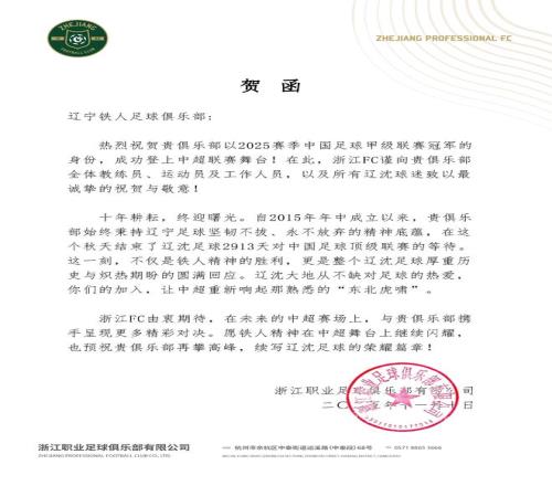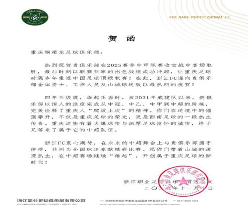 浙江職業(yè)足球俱樂部分享兩封賀函并寫道:“祝賀 成功沖超,2026中超見!”
