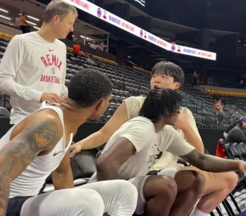 無論是賽前熱身、比賽過程中,還是暫停期間,都能看到楊瀚森獨立用英語與隊友、教練溝通的身影。這恰恰說明,他的英語水平一直在穩(wěn)步提升。
