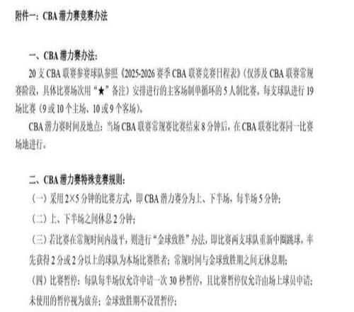 CBA新賽季的重大改革可謂雙管齊下,首先,比賽單節(jié)時間從12分鐘調(diào)整為10分鐘,使比賽總時長從48分鐘壓縮至40分鐘,這與國際籃聯(lián)標準保持一致,縮短比賽時長的討論自2023年中國男籃兵敗世界杯后便一直存在,前中國男籃主帥喬爾杰維奇曾指出,CBA比賽時間長但強度低,導致球員在國際賽場難以適應節(jié)奏,更引人注目的是“CBA潛力賽”的推出,據(jù)多家媒體報道,這所謂的“第五節(jié)”將安排在常規(guī)比賽結束8分鐘后進行,采用2×5分鐘的比賽方式,上下半場之間休息2分鐘,若比賽在常規(guī)時間內(nèi)戰(zhàn)平,則采用“金球致勝”機制,雙方重新中圈跳球,率先獲得2分或2分以上的球隊獲勝