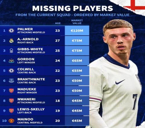 此次未入選英格蘭隊身價前10:帕爾默、阿諾德前2,梅努在列