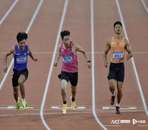 陳冠鋒(中)、謝震業(yè)(右)在男子百米復(fù)賽中。