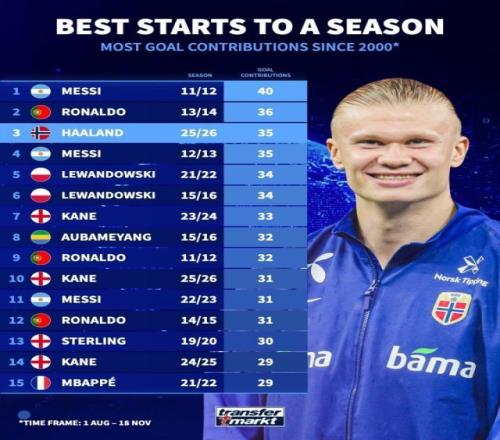 11月20日報道宣稱 德轉(zhuǎn)統(tǒng)計了本世紀賽季開局的進球貢獻數(shù),哈蘭德以35粒進球位居歷史第三,僅次于梅西和C羅。