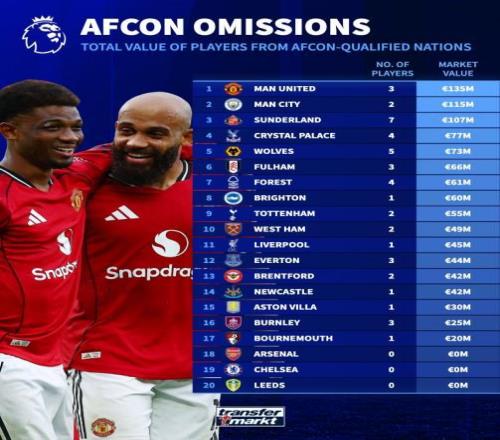 德轉(zhuǎn)列英超各隊(duì)非洲杯晉級國家球員總身價(jià):曼聯(lián)第1,曼城第2