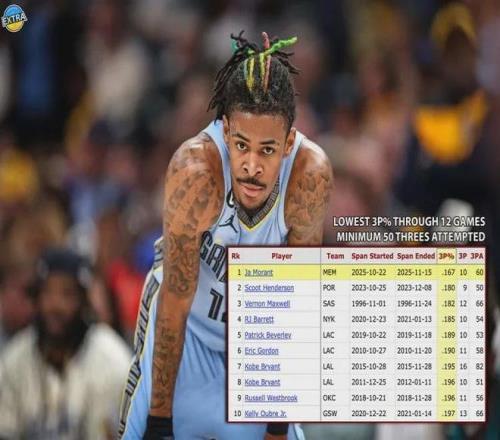 據(jù)統(tǒng)計(jì),迄今為止莫蘭特三分球60中10,命中率低至可憐的16.7%,在NBA史上所有賽季前12場(chǎng)三分出手?jǐn)?shù)至少50次的球員里面命中率最低。