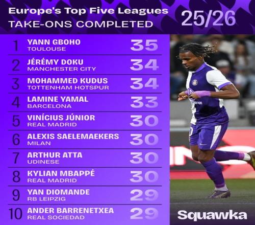五大聯(lián)賽本賽季成功過(guò)人榜
